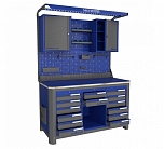 Нагрузка на столешницу 1500 кг. Столешница из листа влагостойкой фанеры марки ФСФ толщиной 40 мм и листом горячекатаной стали толщиной 5 мм. Рама верстака выполнена их холоднокатаной стали. Модуль верстака выполнен сварными. Ящики в модулях устанавливаются на шариковых телескопических направляющих полного выдвижения. Квадратная перфорация для установки крючков, держателей. Размеры: 1982x1993x743 мм.