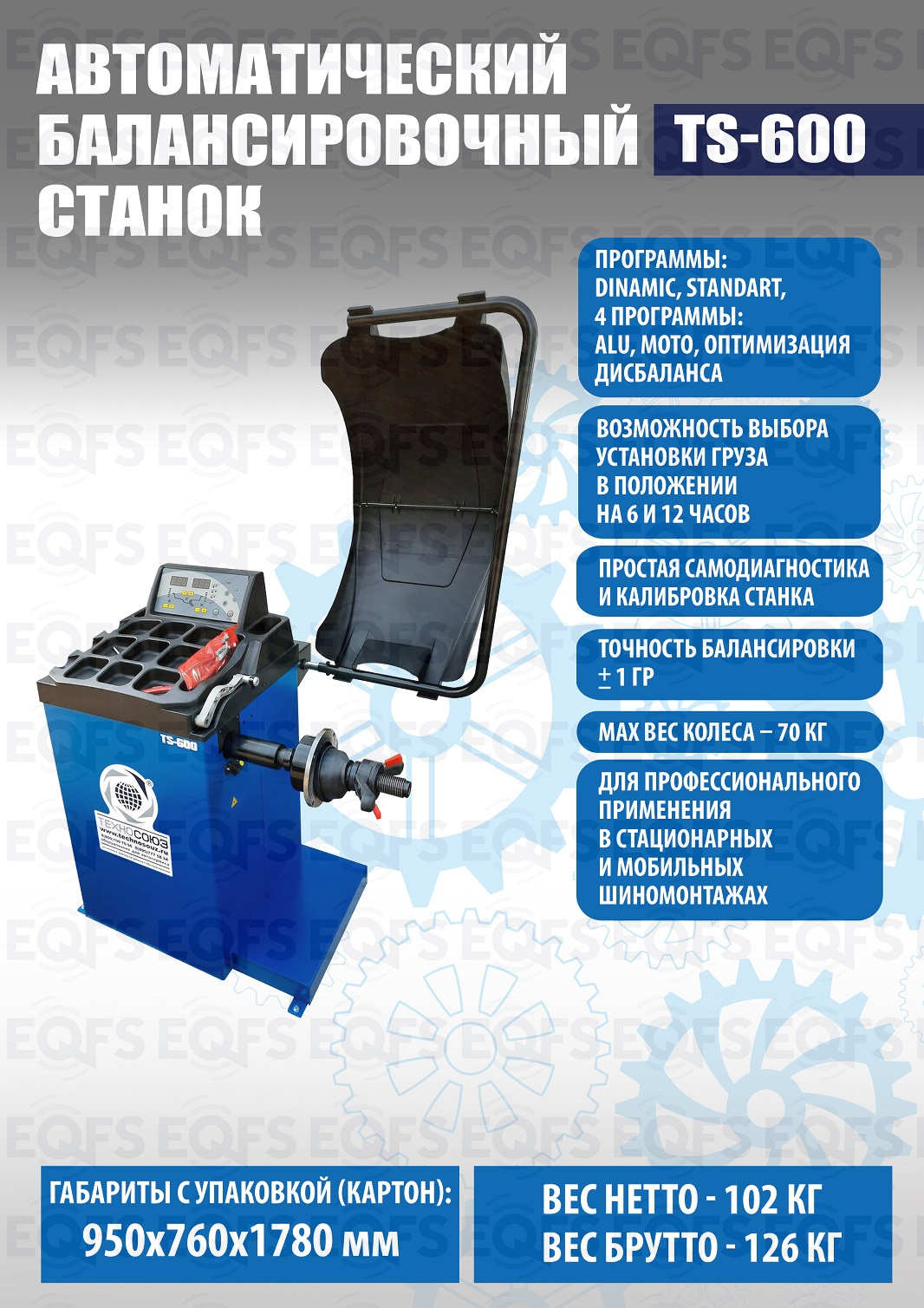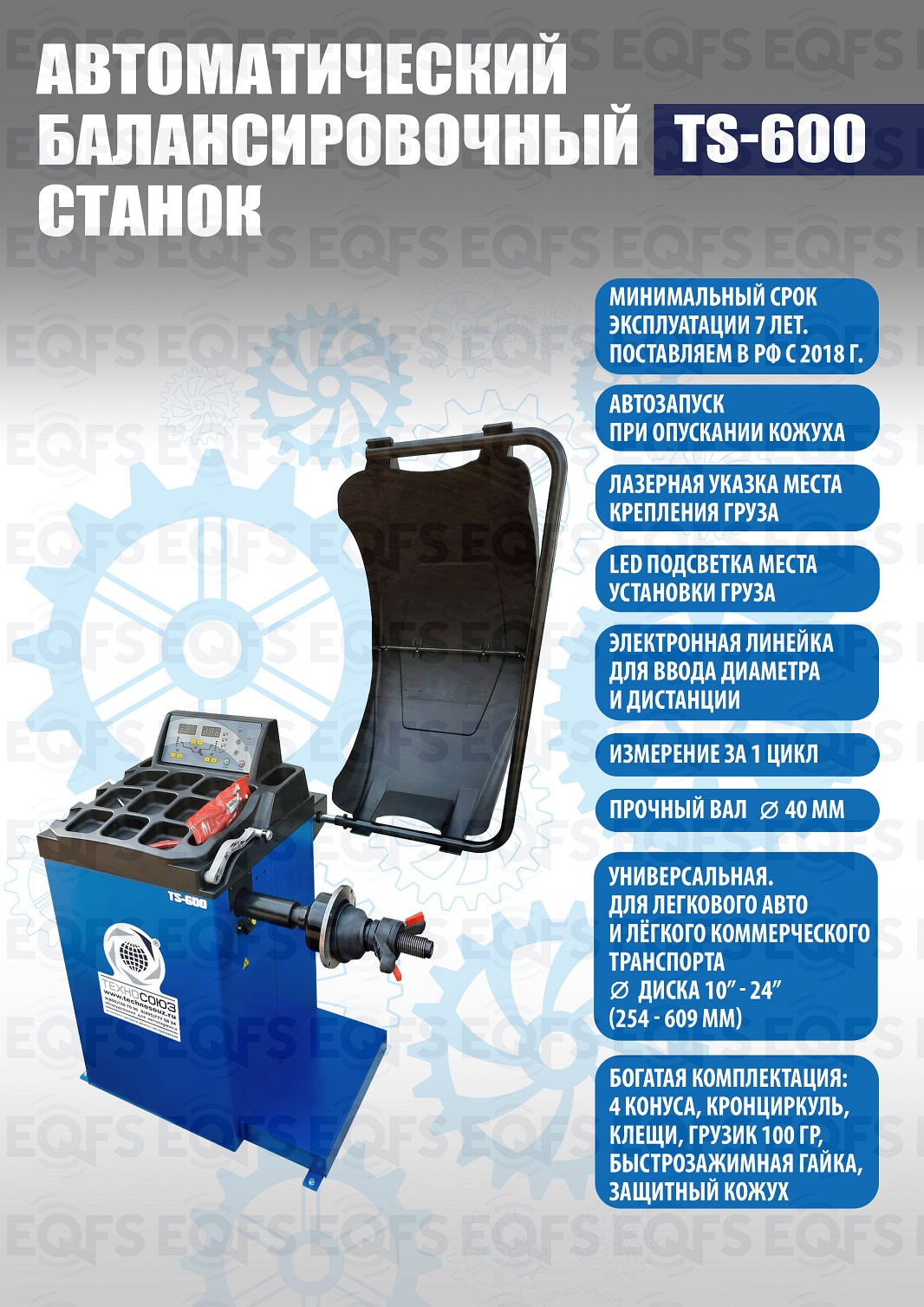 TS-600 Балансировочный станок автоматический. Автоматический ввод дистанции и диаметра диска. Остановка и фиксация колеса в месте установки грузика. Лазерная указка места установки грузика на 6 часов. Старт опусканием кожуха или с кнопки. Для колес легковых автомобилей, мотоциклов и легких грузовиков с диаметром диска с резиной до 800 мм. Размеры диска: ширина 3–10” (76-254 мм), диаметр диска 10–24” (254÷609 мм). Вал- 40мм. Гарантия 18 мес – наш монтаж, 12 мес – самостоятельная установка. В комплекте: кожух с автозапуском + клещи + кронциркуль + быстрозажимная гайка + набор конусов.