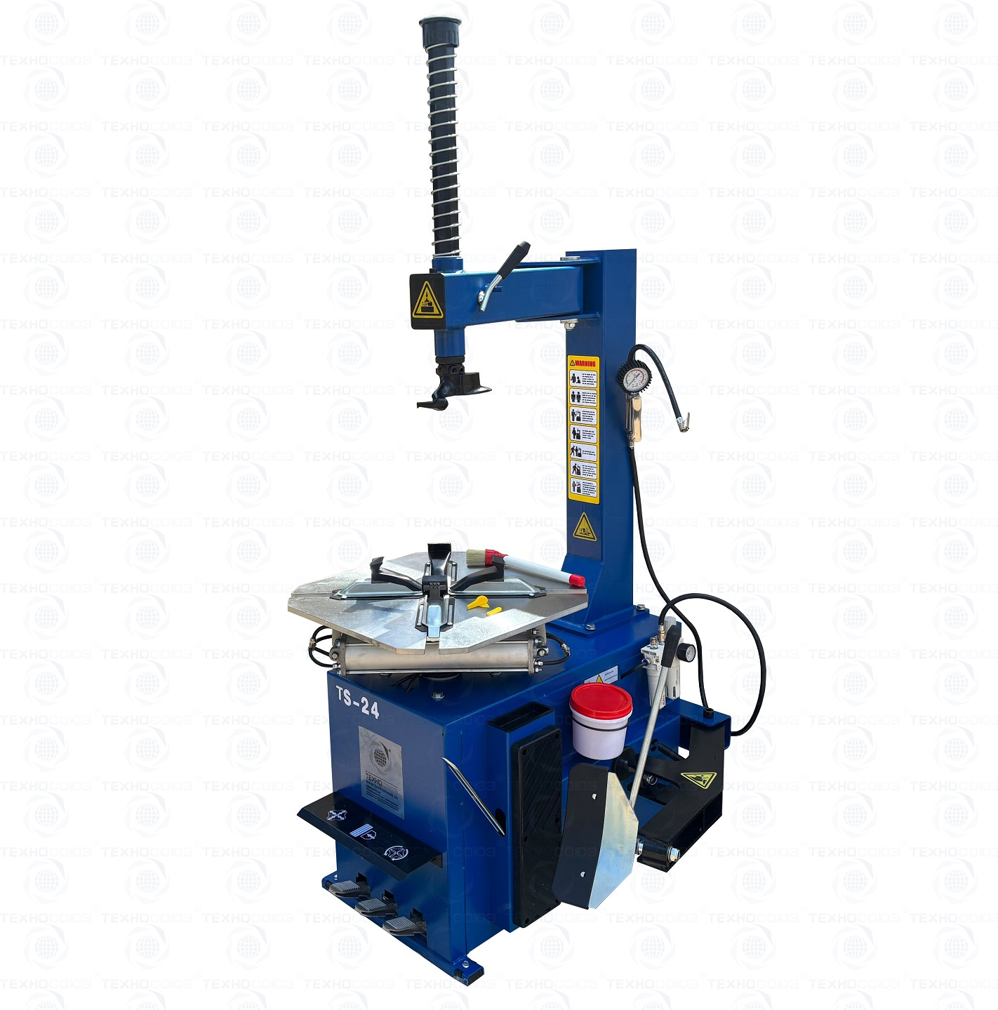 TS-24 шиномонтажный станок. Полуавтоматический. Квадратный стол. Для дисков: внешний 11÷21”, внутренний 12÷24”. Усилие отрыва покрышки 2700 кг. В комплекте: пистолет для подкачки шин + монтажка + пластиковые накладки на зажимные кулачки + регулятор давления с влагоотделителем и манометром