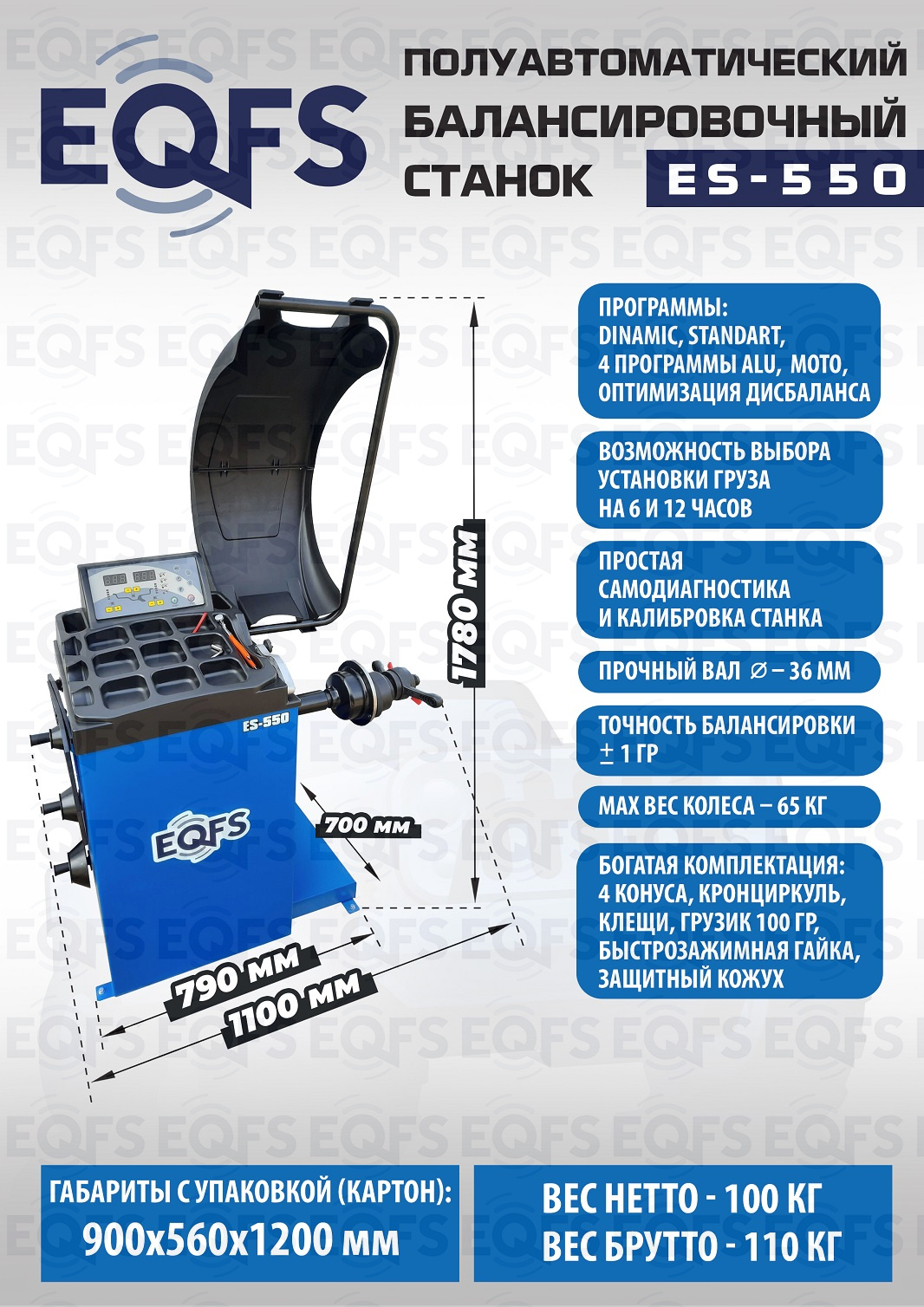 ES-550 Балансировочный станок. Полуавтомат. Удобный и понятный интерфейс. Автозапуск опусканием кожуха. Автоматический ввод дистанции и диаметра диска. Лазерная навигация. Автокалибровка. Для колес легковых автомобилей, мотоциклов, «Газелей», «Спринтеров» с диаметром диска с резиной до 800 мм. Размеры диска: ширина 3–10” (76-254 мм) , диаметр диска 10–24” (254÷609 мм). Вес ≤ 65 кг. Вал- 36 мм. Точность ±1гр. 220 В. Режимы работы DINAMIC, STATIC, ALU1, ALU2, ALU3, ALUS, ST. Гарантия 12 мес.