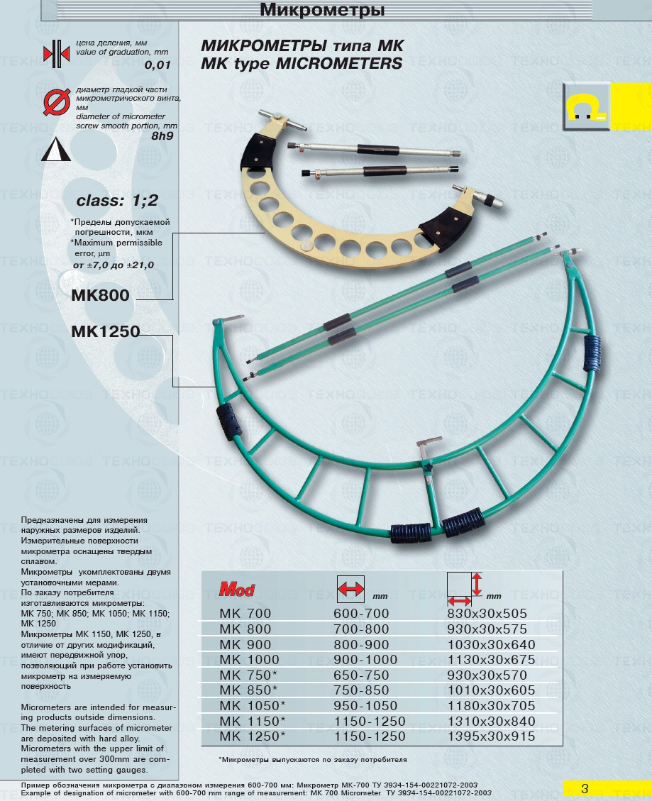 Цена деления 0,01 мм. Диапазон измерения от 750-850 мм. Для измерения наружных размеров изделий. Измерительные поверхности микрометра оснащены твердым сплавом. Микрометры укомплектованы установочная мера 2 шт. Класса точности 1. ГОСТ 6507-90. Поставляется в двух вариантах с поверкой и без поверки!