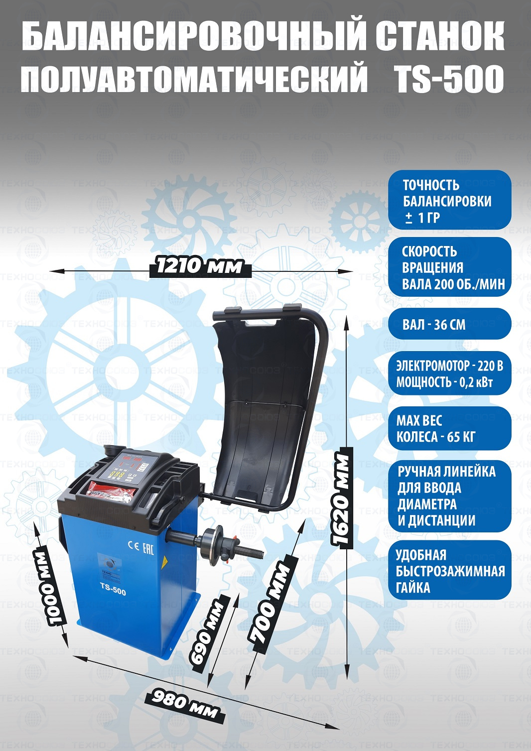+ TS-500 Полуавтоматический балансировочный станок для колес легковых автомобилей, мотоциклов и легких грузовиков. В комплекте: кожух с автозапуском + клещи + кронциркуль + быстрозажимная гайка + набор конусов. Для балансировки колес с диаметром диска с резиной до 760 мм. Размеры диска: ширина 3–9” (76-228 мм) , диаметр диска" -  10–21” (254-533 мм). Вал-36 мм. Максимальный вес колеса с диском – 65 кг. Точность ±1гр. Напряжение 220В. Данные станки возим более 10 лет. Надежные - в сезон не подведут! Напряжение шиномонтажных станков 220В или 380В на выбор.
