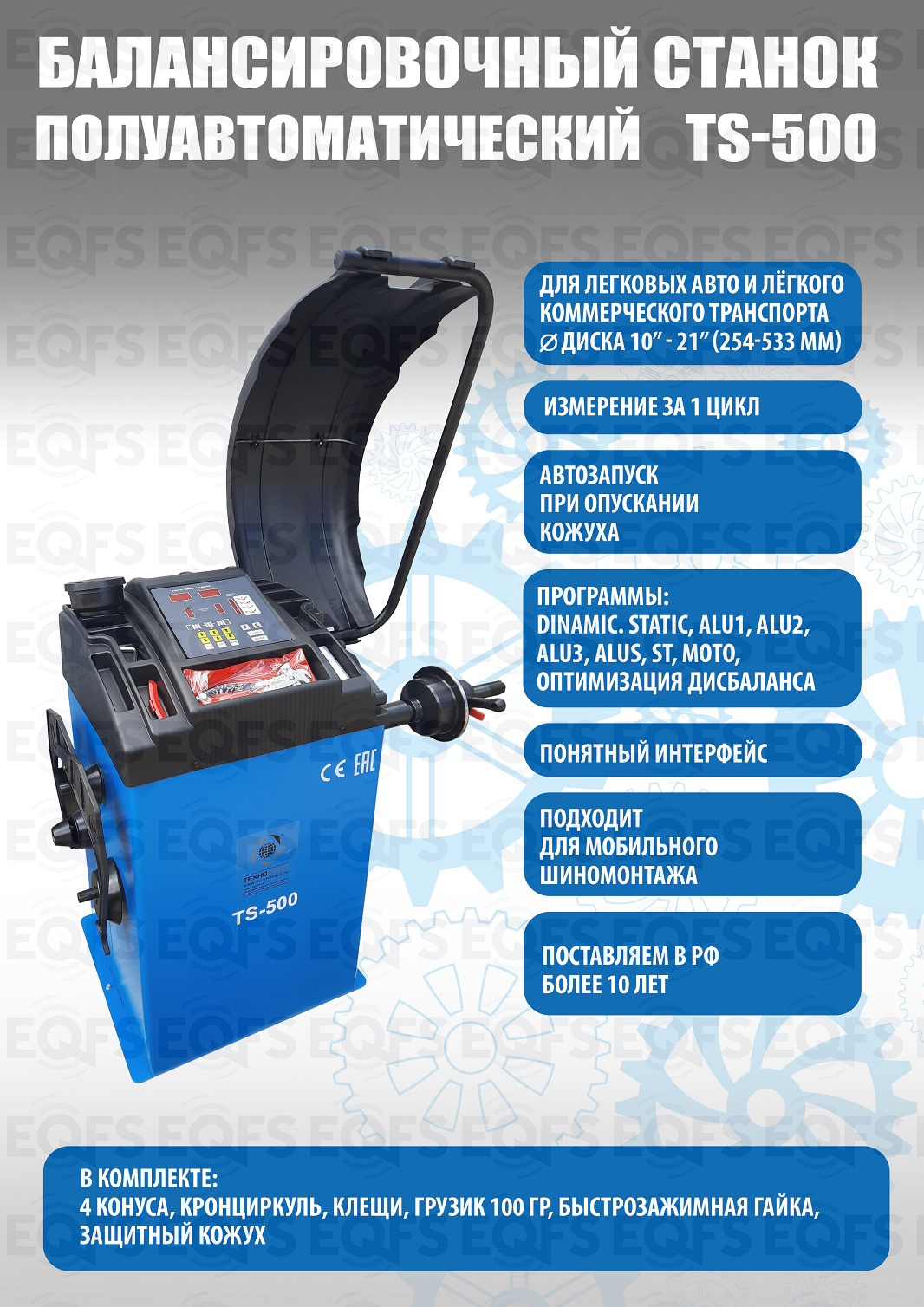 TS-500 Полуавтоматический балансировочный станок. В комплекте: кожух с автозапуском + клещи + кронциркуль + быстрозажимная гайка + набор конусов. Для колес диаметром до 760мм. Размеры диска: ширина 3–9” (76-228 мм) , диаметр колеса" - 10–21” (254-533 мм). Максимальный вес колеса с диском – 65 кг. C кожухом. Точность ±1гр. Напряжение 220В.